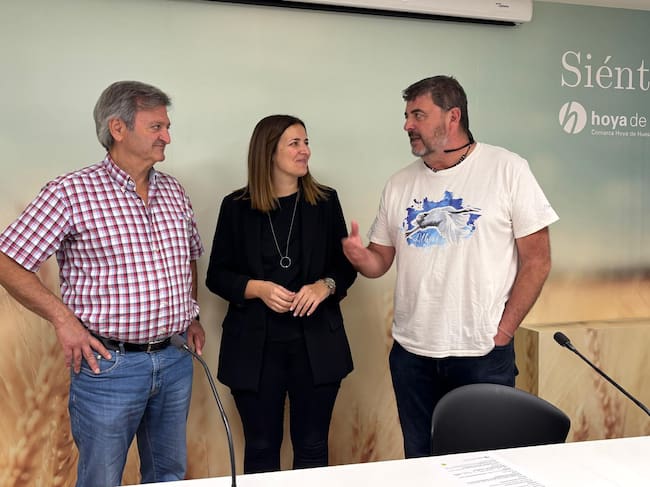 Carlos Ciria, alcalde de Lupiñén-Ortilla, Mónica Soler, presidenta de la Comarca de la Hoya de Huesca y Pablo Vallés, educador ambiental de la Alberca de Alboré