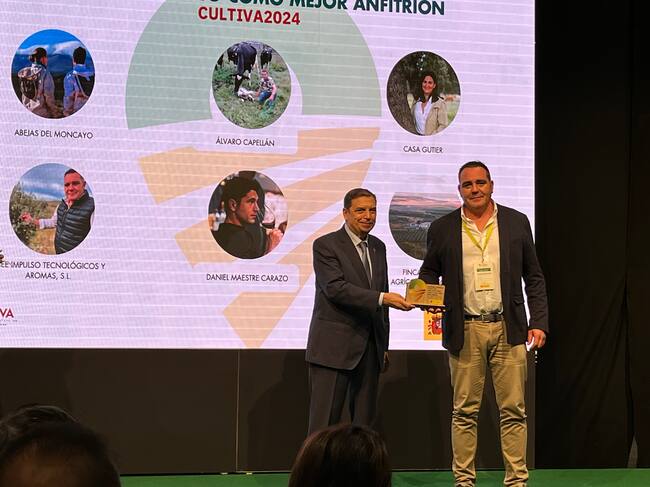 El Centro Especial de Empleo Impulso Tecnológico Aromas de Fundación Térvalis ha recibido el premio a la Mejor Explotación Anfitriona del programa CULTIVA que impulsa el Ministerio de Agricultura, Pesca y Alimentación. José Miguel Muñoz, director de operaciones de la Fundación, ha recogido el galardón de manos del ministro de Agricultura, Luis Planas, durante el segundo Encuentro Nacional del Programa que se ha desarrollado en el marco de Expo Sagris en IFEMA (Madrid).