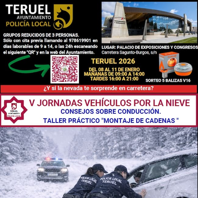 El Ayuntamiento de Teruel, a través de la Policía Local, pone en marcha la quinta edición de las jornadas de vehículos por la nieve, una iniciativa que busca enseñar a los conductores a colocar cadenas y afrontar la conducción en condiciones invernales.