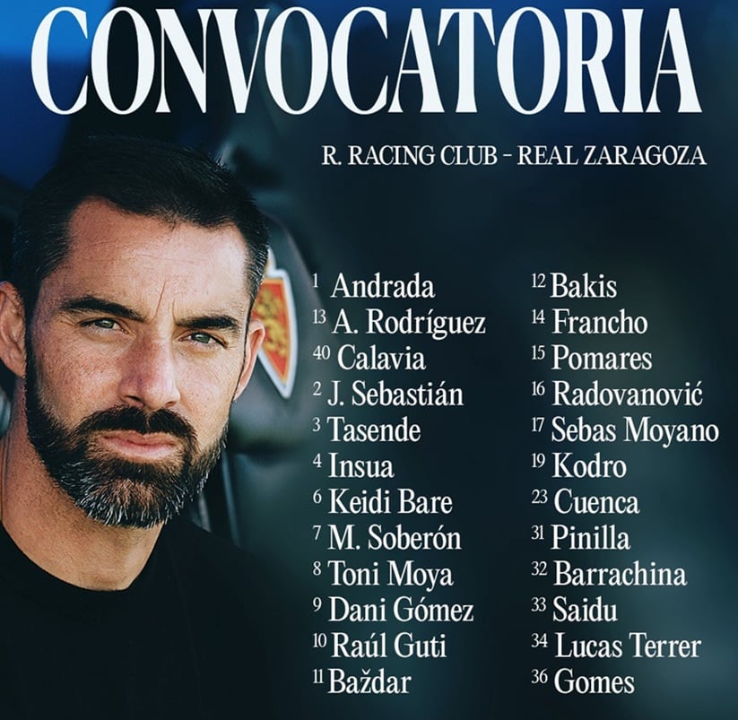 El Real Zaragoza ya se encuentra en la carretera camino de Santander, donde este sábado (21,00 horas) cerrará la primera vuelta con un preocupante déficit de puntos. La expedición zaragocista ha partido desde la Ciudad Deportiva con destino a la capital cántabra. Insua, tras cumplir un partido de sanción, ha vuelto a una convocatoria en la que no están los lesionados una lista en la que no estará Valery, que esta mañana no se ha entrenado por un proceso febril, tampoco los lesionados Aguirregabiria, Paulino y Pau Sans, y a la que vuelve Insua, tras cumplir un partido de sanción, pero no estará Tachi por cinco amarillas. Akoukou y Kosa, que siguen con sus diferentes molestias, son dos de los candidatos a salir en este mercado.