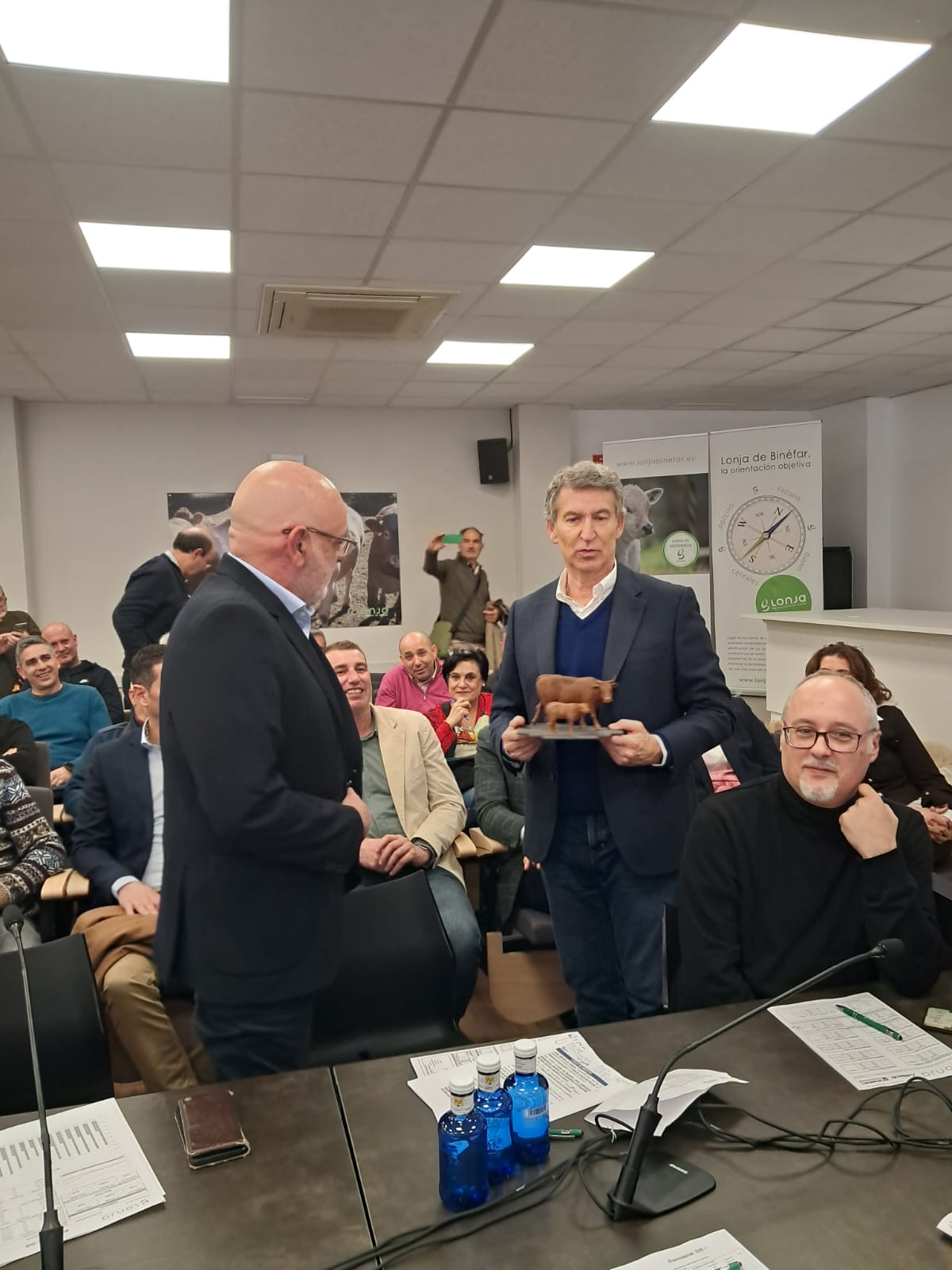 Alberto Núñez Feijóo visita la Lonja Agropecuaria de Binéfar y recibe un detalle.