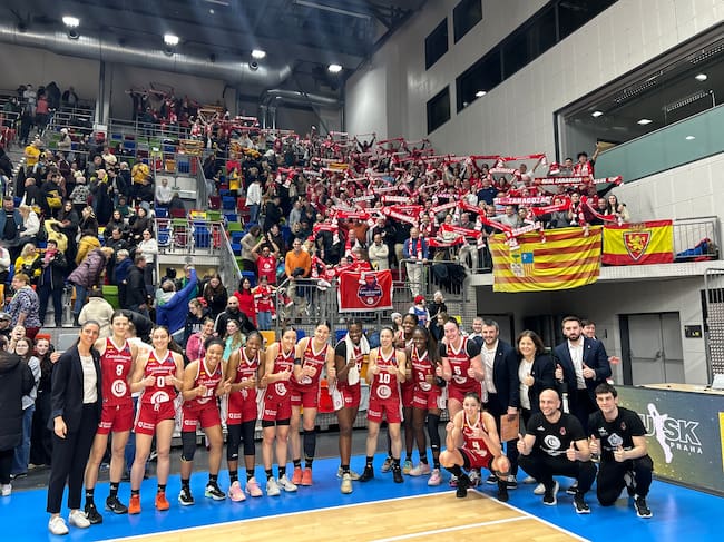 El Casademont celebra la victoria en Praga, con la afición desplazada, en el primer partido del Play In / Casadmont