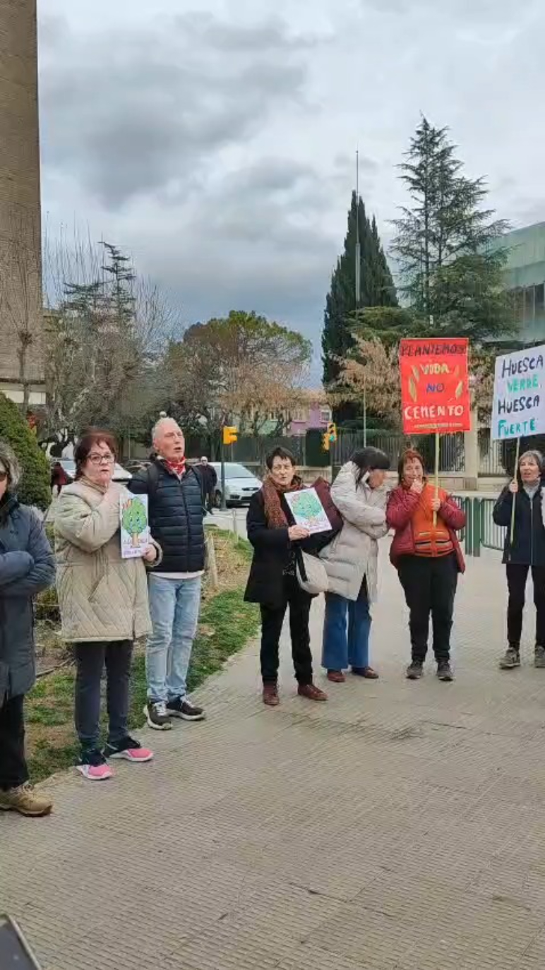 Nueva protesta por parte de la Plataforma Árboles Vivos de Huesca con cánticos y pancartas de "No a la tala, Huesca se planta" y "Menos hormigón, más vegetación". Una veintena de integrantes de la entidad se han concentrado en el parque Jardín Fuente del Ibón para denunciar lo que consideran un "nuevo arboricidio" con la inminente ejecución de la macro-rotonda, prevista en el marco del proyecto de urbanización de Harineras. Durante la concentración con pancartas y cánticos se ha leído un manifiesto.