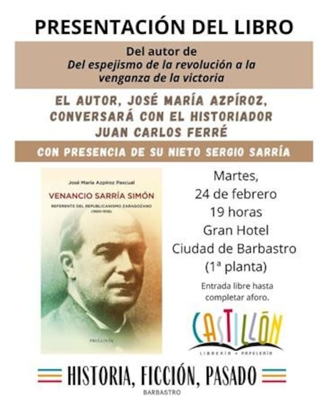 Barbastro acoge la presentación del libro "Venancio Sarría Simón, referente del republicanismo zaragozano (1900-1936). El acto se celebrará este martes, a las 19.00 horas, en el Gran Hotel Ciudad de Barbastro. Organiza Librería Castillón y la actividad se enmarca dentro en el ciclo cultural “Historia, ficción, pasado”, iniciado el año pasado.