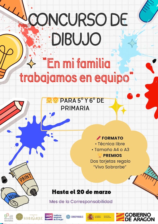 - Concurso de dibujo escolar. Dirigido al alumnado de 5º y 6º de Primaria, bajo el lema “En mi familia trabajamos en equipo”. La actividad busca promover, desde la infancia, la reflexión sobre el valor de compartir tareas en el hogar. Los dibujos finalistas formarán parte de una exposición comarcal, y se otorgarán dos premios en formato tarjeta regalo, canjeables en los comercios adheridos a la campaña “Vivo Sobrarbe”, reforzando así el apoyo al comercio local.
