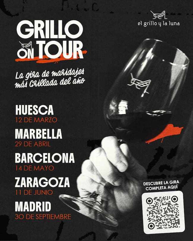 Bodegas El Grillo y La Luna escoge cinco ciudades españolas para celebrar su segundo "Grillo On Tour". Desde el próximo 12 de marzo y hasta el 30 de septiembre, el vino más icónico de la bodega del Somontano viajará, junto a sus hermanos Hop Hop y Canto del Grillo (Cri, Cri), a Madrid, Barcelona, Marbella, Zaragoza y Huesca. En cada destino se ha preparado una cena maridaje muy especial para todos los fans de los vinos del Grillo y la Luna.
