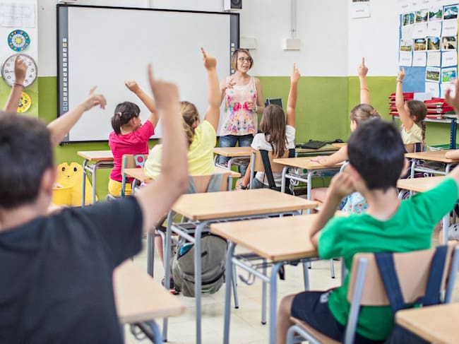 Niños y niñas levantan la mano en un aula de un Colegio / xavierarnau