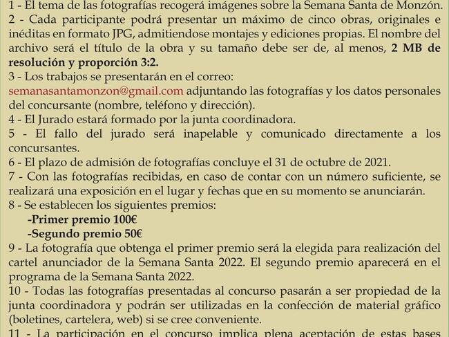 El plazo de presentación de fotografías se prolonga hasta el 31 de octubre de 2021. Deberán enviarse al correo semanasantamonzon@gmail.com adjuntando la fotografía y los datos personales del autor. Más información, en las redes sociales de Semana Santa Monzón.