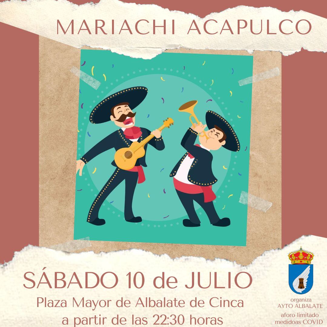 El Ayuntamiento de Albalate de Cinca continúa con la organización de una variada programación cultural para este verano. Este sábado, es el turno del “Mariachi Acapulco”, que ofrecerá una actuación a las 22.30h en la plaza Mayor. Aforo limitado a las medidas covid.