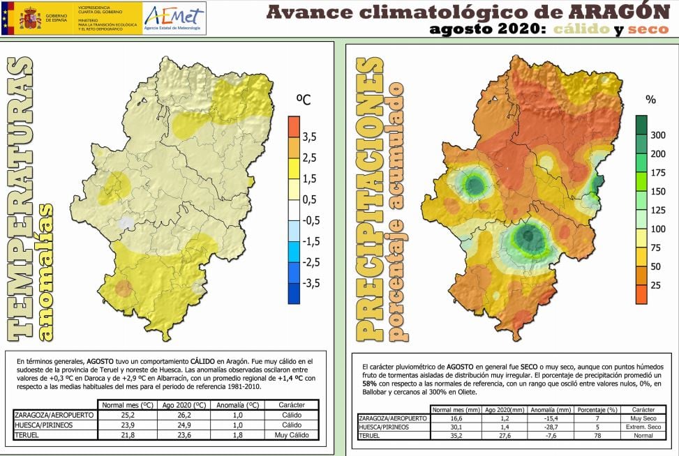 La Unidad de Estudios y Desarrollos Meteorológicos de la delegación territorial de la Agencia Estatal de Meteorología ha dado a conocer el avance climatológico del pasado mes de agosto. En Aragón el mes fue cálido en cuanto al comportamiento de sus temperaturas, y seco o muy seco en cuanto a sus precipitaciones. En la provincia de Huesca, el mes fue cálido y extremadamente seco.