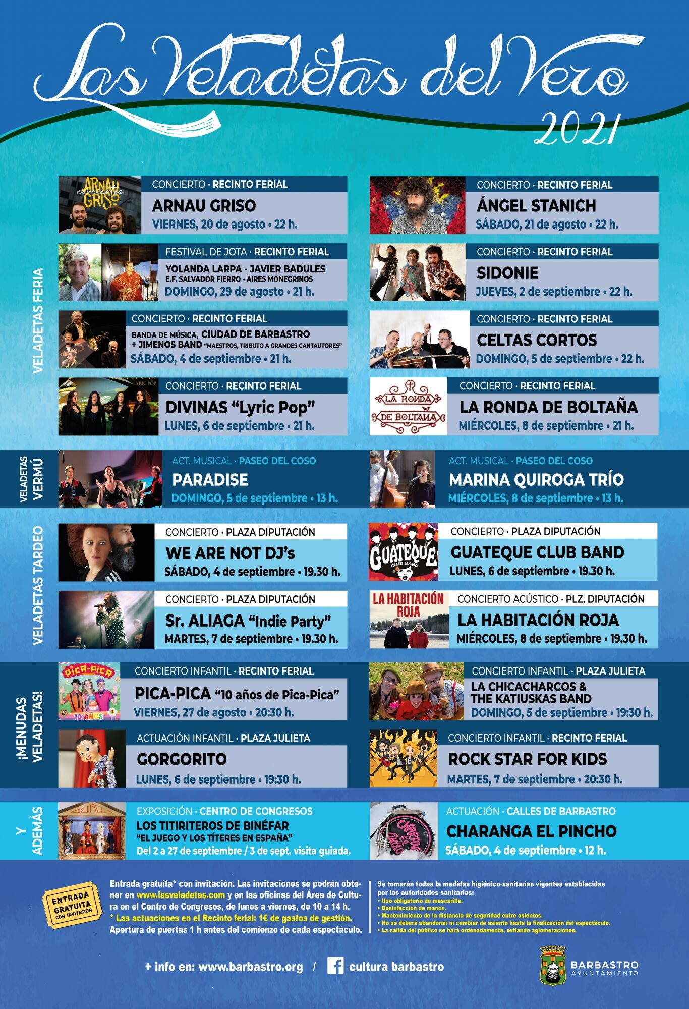 A buen ritmo va también la retirada de invitaciones para las actuaciones musicales integradas en Las Veladetas Feria, que se desarrollarán en la zona exterior del Recinto Ferial, en concreto Ángel Stanich (21 de agosto); el tradicional Festival de Jota con la participación de la Escuela de Folklore Salvador Fierro, Yolanda Larpa y Javier Badules, además de la rondalla de Aires Monegrinos (29 de agosto); la Banda de Música ‘Ciudad de Barbastro’, acompañada de Jimenos Band (4 de septiembre); y Divinas (6 de septiembre).