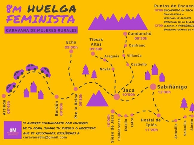 La Plataforma 8M Alto Gállego y Jacetania ha preparado diversas actividades con el día 8 de marzo como central. Para ese viernes convocan a la ciudadanía a la huelga feminista del Día Internacional de la Mujer. Este año, la Plataforma 8M ha organizado lo que han llamado “La caravana de mujeres rurales” para animar y facilitar a las mujeres de los pueblos a unirse a las concentraciones que habrá en Sabiñánigo, a las 12 horas, y en Jaca, a las 19 horas.