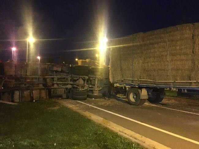 El accidente se produjo cuando el camión intentó esquivar un tractor que se incorporaba a la nacional desde la rotonda del tanatorio. El conductor de la mercancía se vio obligado a girar bruscamente y el camión articulado se cruzó y volcó en la calzada dejando la carga desparramada por la vía. Primero se retiraron las pacas y seguidamente dos grúas sacaron el camión de la carretera.