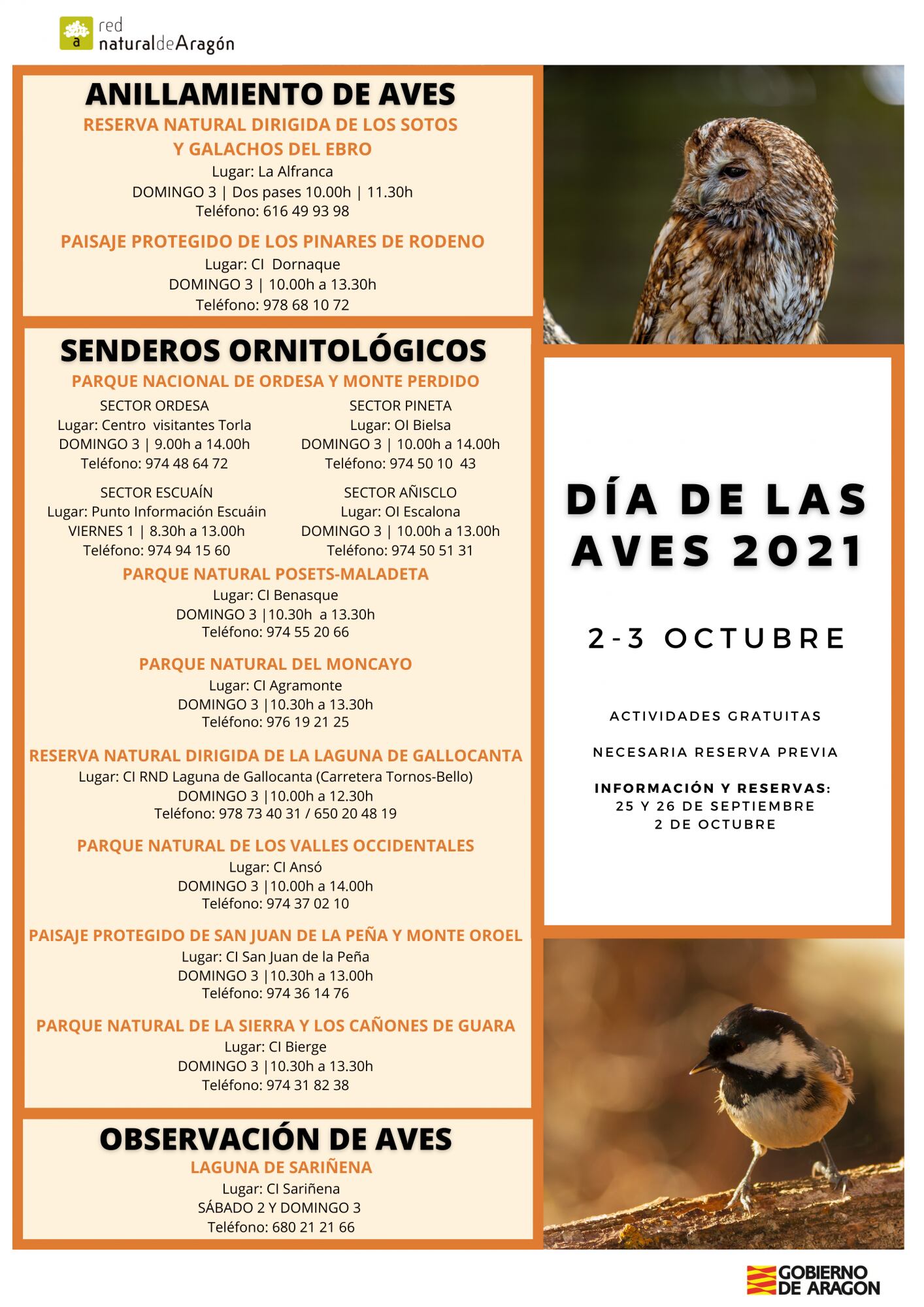 Para celebrarlo, en esta ocasión, la Red Natural de Aragón ha puesto en marcha una serie de actividades gratuitas dirigidas a público de todas las edades en un total de 10 espacios naturales protegidos de la Comunidad Autónoma. Propuestas como senderos ornitológicos, anillamientos científicos o jornadas de observación e identificación de aves; todas ellas dirigidas por educadores ambientales.