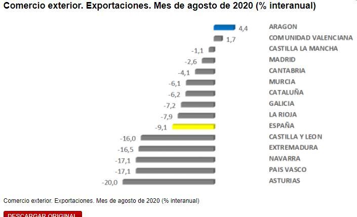 Las exportaciones aragonesas registraron un incremento interanual del 4,4% en el mes de agosto de 2020, mientras que en España el descenso medio fue del 9,1%, de acuerdo con los datos hechos públicos este lunes por el Ministerio de Industria, Comercio y Turismo. De esta forma, Aragón lidera el ranking regional en crecimiento de las exportaciones durante el mes de agosto. A pesar del impacto económico del Covid-19 en la coyuntura actual, las ventas exteriores regionales siguen creciendo respecto al año anterior, aunque en términos mensuales se reducen respecto al mes de julio, fenómeno estacional propio del mes de agosto, tal y como reflejan los datos disponibles. No obstante, y tras un mes de julio de record, la cifra de exportaciones es la más alta de un mes de agosto en toda la serie histórica. En concreto, las exportaciones aragonesas alcanzaron un valor de 937,5 millones de euros en el mes de agosto. Por su parte, en el acumulado del año 2020 (de enero a agosto) las ventas exteriores aragonesas alcanzaron un valor de 8.159,4 millones de euros, lo que supone un descenso del 7,2% respecto al mismo período de 2019. Por su parte, en España las exportaciones acumuladas en los primeros ocho meses del año cayeron un 14,0% anual.