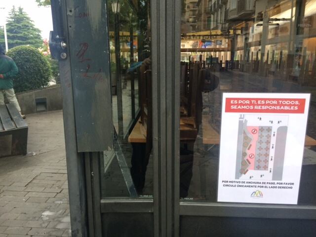 Las calles más céntricas de Jaca se han llenado de carteles que ofrecen indicaciones para la circulación de los viandantes. El objetivo es organizar el tránsito peatonal para poder respetar la distancia de seguridad. Se han pintado líneas de colores en la calzada para acotar el espacio de las terrazas, que se ha ampliado, y separarlo de la zona de tránsito.