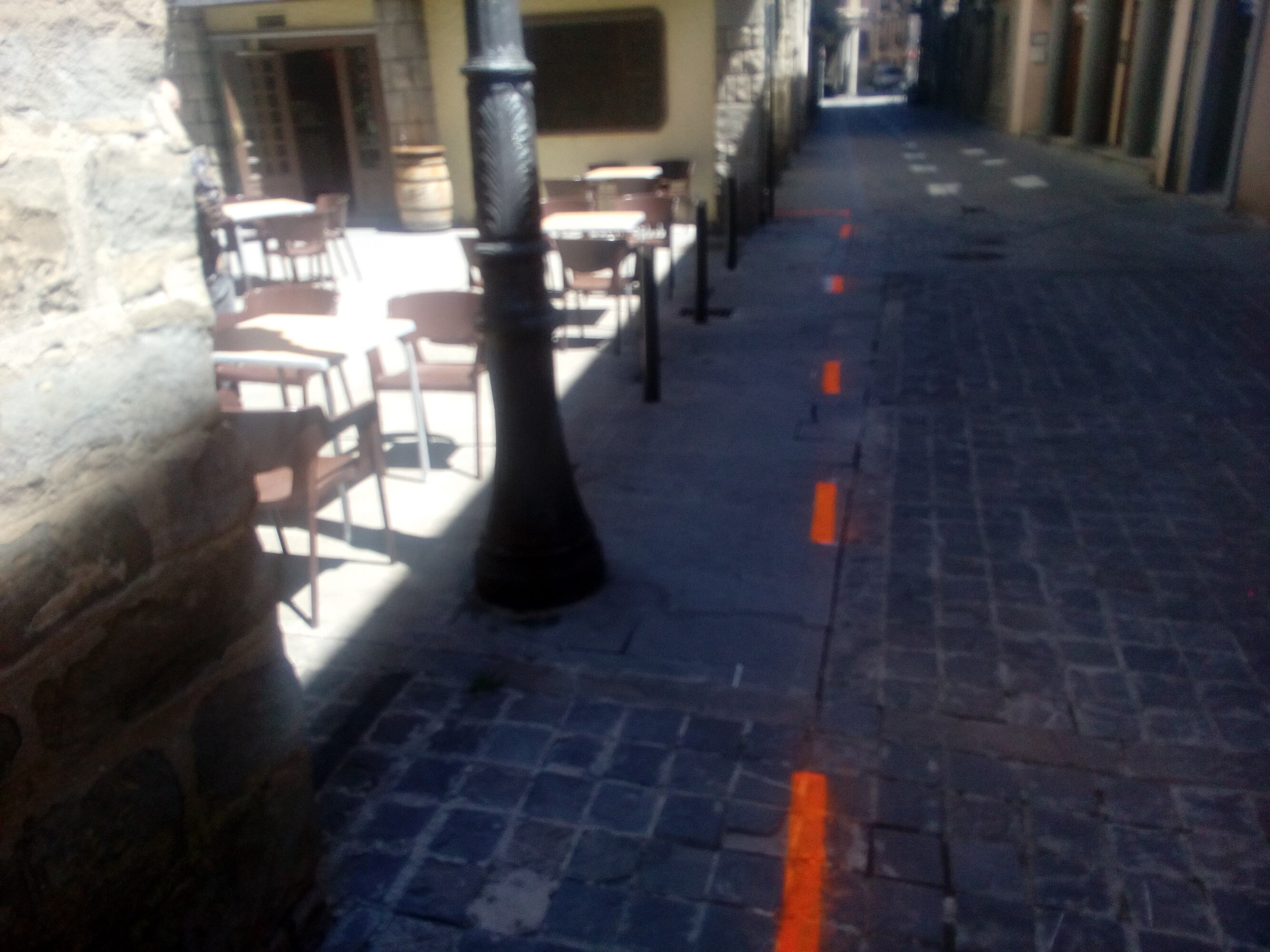 Los viandantes no deberán nunca sobrepasar las rayas naranjas de separación cuando circulen por las calles y plazas de la ciudad y deberán siempre circular por los lugares de paso que quedan marcados entre las rayas naranjas, que limitan la zona de uso de las terrazas, y las paredes de los edificios u otros elementos que limiten el lugar de paso, dependiendo de cada caso.
