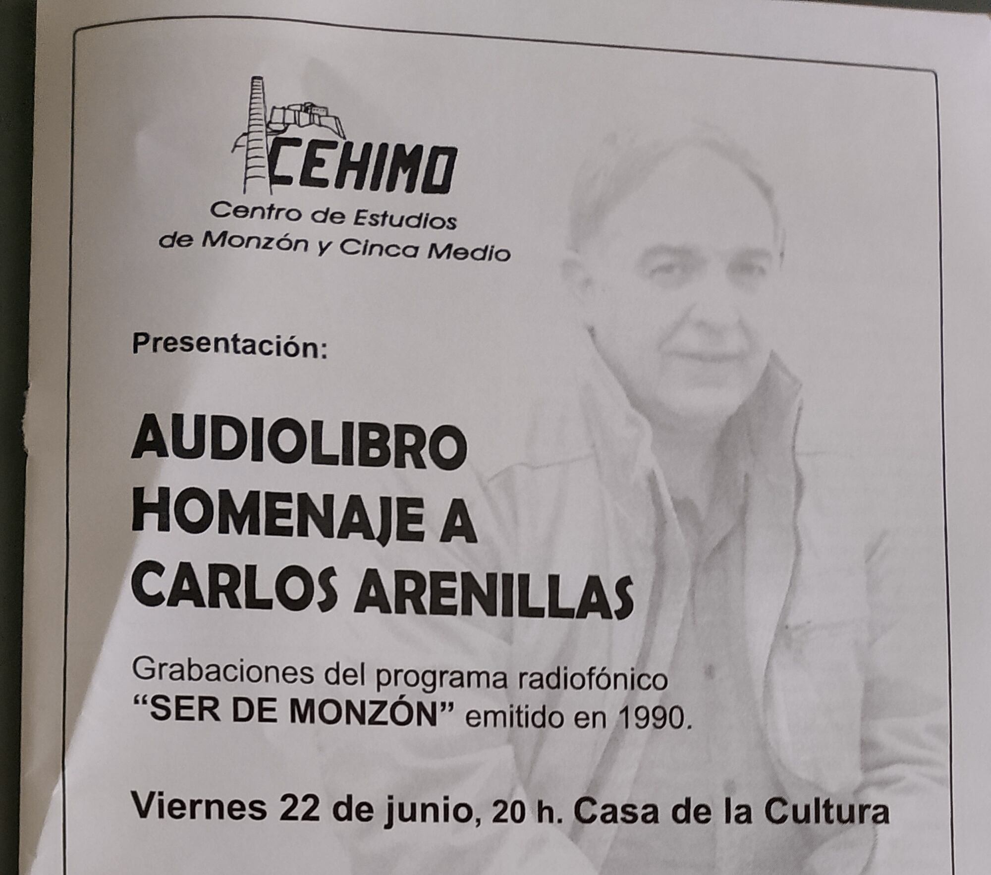 El Centro de Estudios de Monzón y Cinca Medio presenta este viernes, día 22 de junio, a las 20.00h en la Casa de la Cultura el Audiolibro homenaje a Carlos Arenilas en el que se recoge las entrevistas realizadas en el marco del programa “Ser de Monzón” emitido en 1990 en Radio Monzón. El miembro de la junta directiva de CEHIMO fallecía en 2016.
