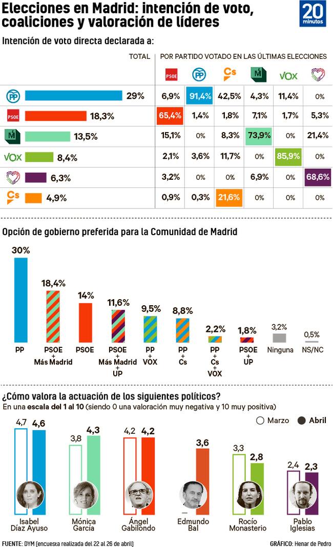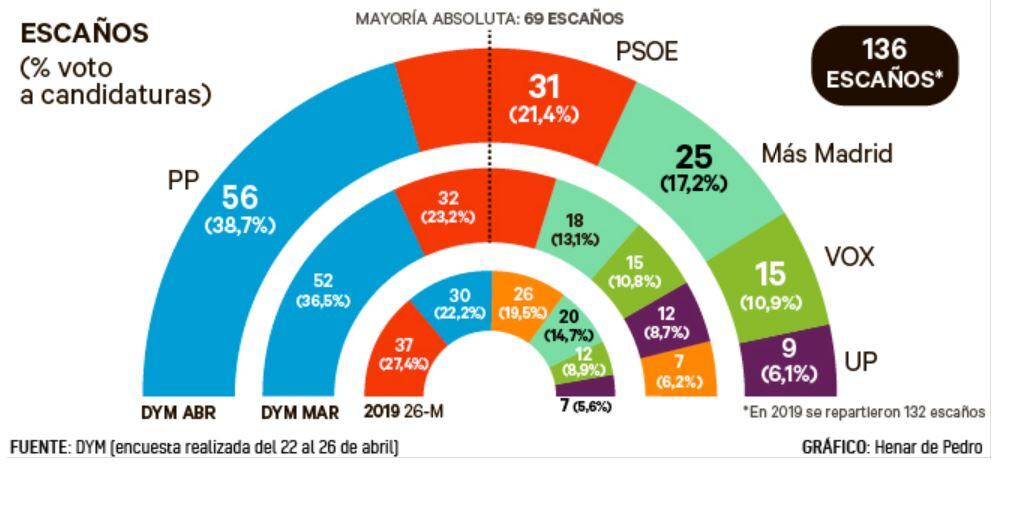 Según el barómetro del Instituto DYM para HENNEO, PP y Vox sumarían 71 escaños frente a los 65 de PSOE, Más Madrid y UP. La mayoría absoluta se logra con 69. Ayuso, Monasterio y Bal aglutinan el 54,2% de los votos -casi un punto más que hace un mes y 3,6 más que en 2019-, mientras que la izquierda se queda en el 44,7%, tres décimas menos que en marzo y 3 puntos menos que en las anteriores elecciones.