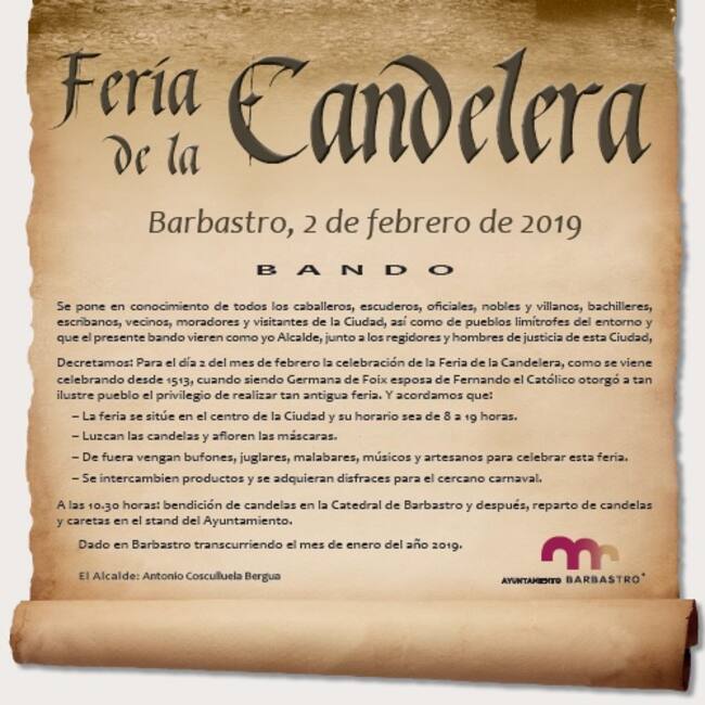 El 22 de septiembre de 1512 la Reina Doña Germana de Foix, segunda esposa de Fernando el Católico, otorgó a la ciudad de Barbastro el privilegio de celebrar la Feria de la Candelera. Desde entonces, se han celebrado más de medio millar de ediciones de esta feria que cada año atrae a miles de personas.