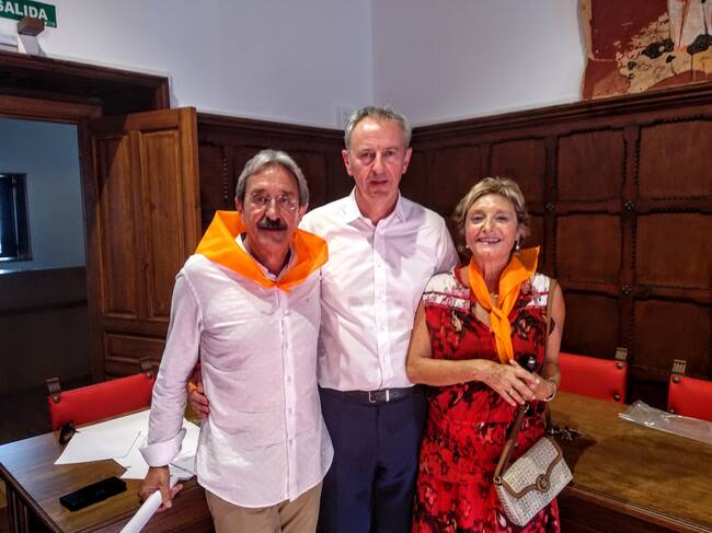 La plaza del Ayuntamiento ha vuelto a ser el punto de partida en Biescas para sus fiestas que comenzaban pasadas las seis de la tarde con la lectura del Pregón anunciador de las mismas a cargo del matrimonio de maestros de la Escuela de Biescas, Jesús Latas y Pili Nivela, que fueron recibidos con fuertes aplausos, después que las damas infantiles, presidentas de 2019, concejales de la corporación, presidenta de la Comarca del Alto Gállego y el alcalde saludaran desde el balcón de la reciente remodelada Casa Consistorial.