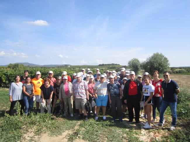 Un grupo de 40 personas con discapacidad intelectual procedentes de centros que gestiona Atades en Zaragoza se desplazaban este martes hasta una parcela de viñedos de Bodega Enate, para participar en las labores de recogida de uva variedad Syrah, con la que se elaborará el Vino de la Amistad 2018. Personal técnico de Enate acompañaba al grupo de viticultores.