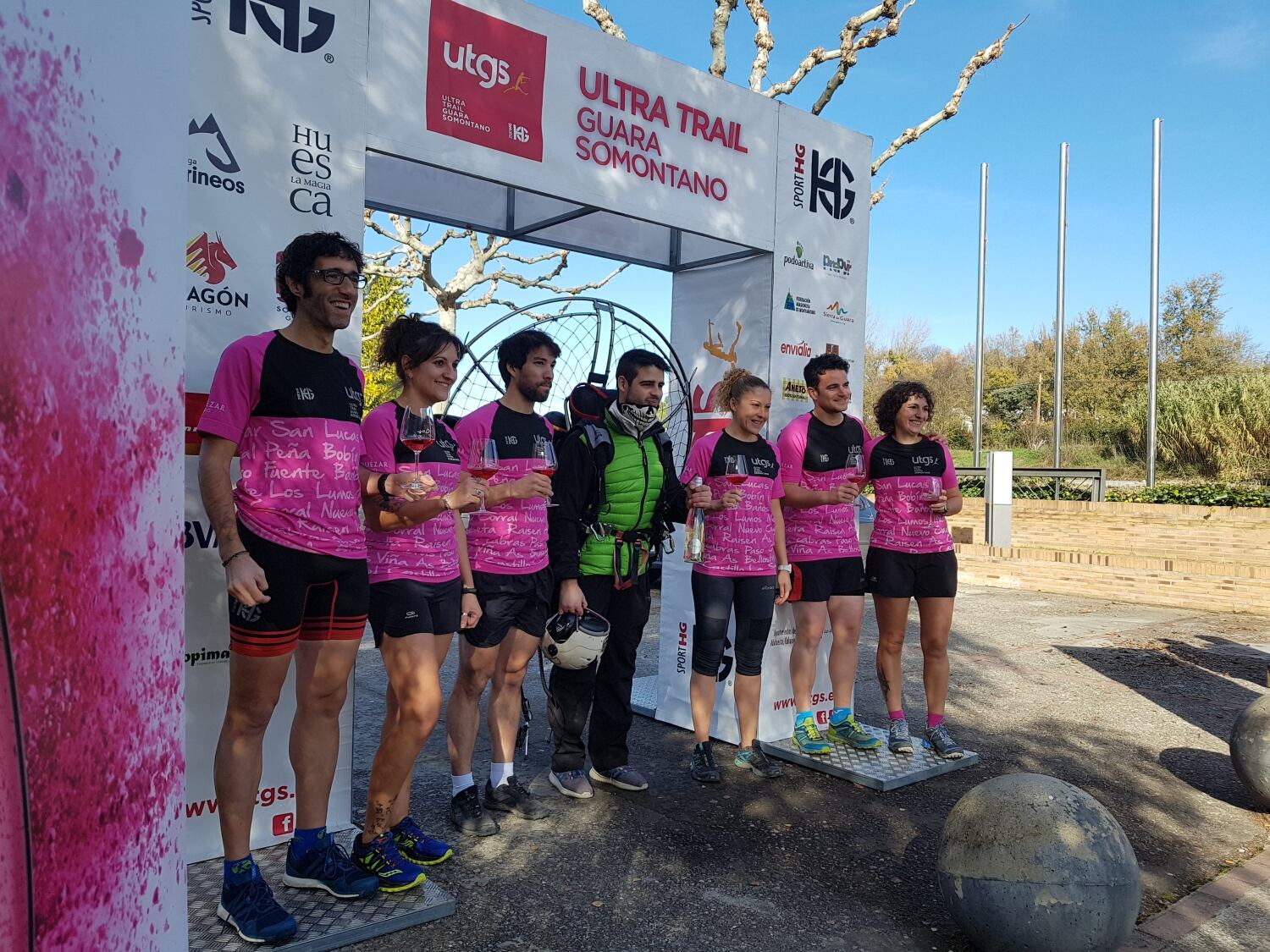 Ambos vinos se han presentado en un original acto que ha tenido lugar en Bodega Pirineos, en Barbastro. Con motivo del X Aniversario de la Ultra-Trail Guara Somontano, un grupo de corredores, formado por Jairo Lanau (alpinista de Barbastro), Guille Fillat (corredor revelación de ultradistancia), Ana Zuñiga y Pau Jordán (corredores experimentados en ultradistancia), Susana Bagüeste y Dulcis Bagüeste (gran experiencia en Ultra Trails), han simulado la llegada a meta portando la nueva cosecha 2018 de Alquézar Rosado. Posteriormente, ha sorprendido la aparición del parapentista barbastrense, Marcos Delgado, del club Club de Vuelo Volataires, que ha aterrizado en la bodega con el nuevo Alquézar Blanco.