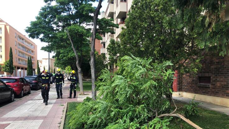 Los bomberos municipales de Huesca han procedido a cortar un árbol en la calle Manuel Estaún, en el barrio de Los Olivos, después de que se hubiera roto previamente la rama que sujetaba la copa a consecuencia del viento y determinarán que la base del tronco estaba suelta y dejarla así podía suponer un riesgo.