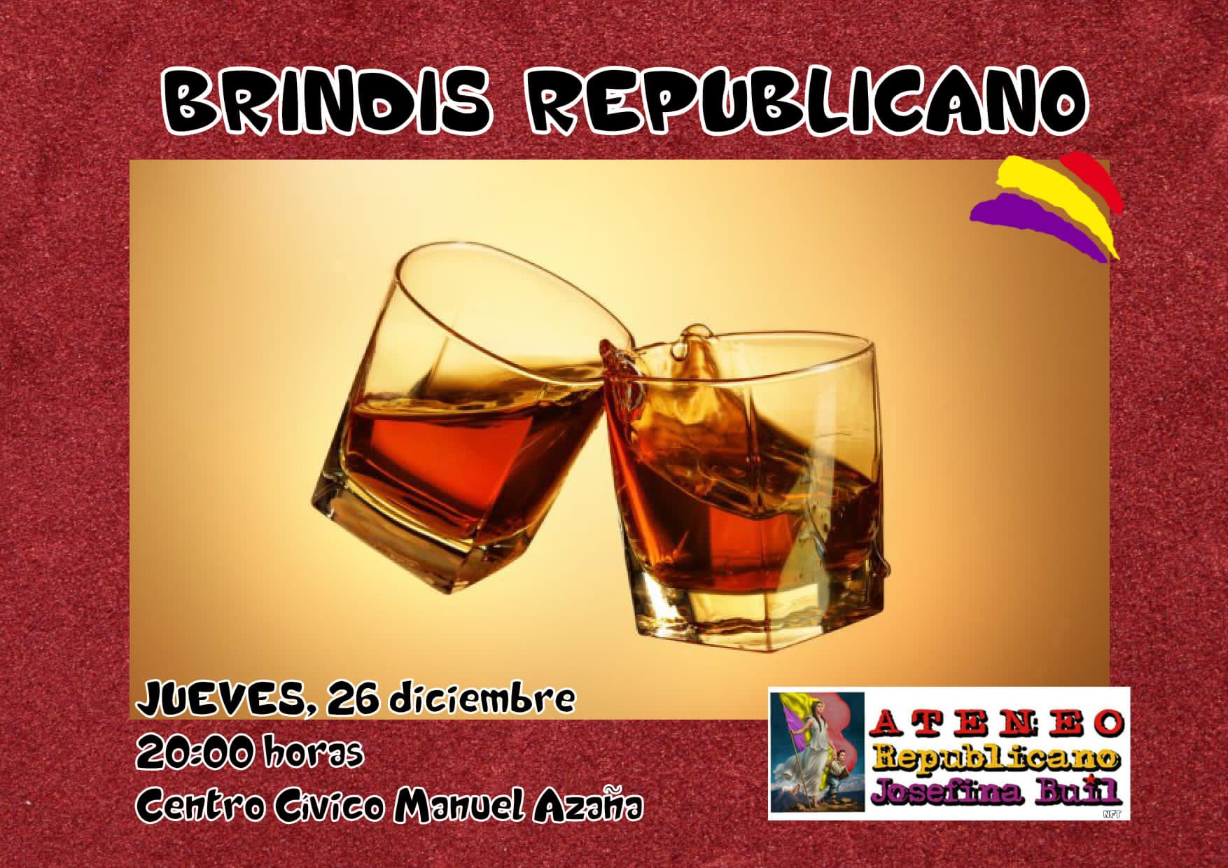 El Ateneo Republicano Josefina Buil de Monzón celebra el próximo el jueves, 26 de diciembre, su tradicional brindis republicano, que tendrá lugar a las 19.45h en el la puerta del Centro Cívico de Monzón.