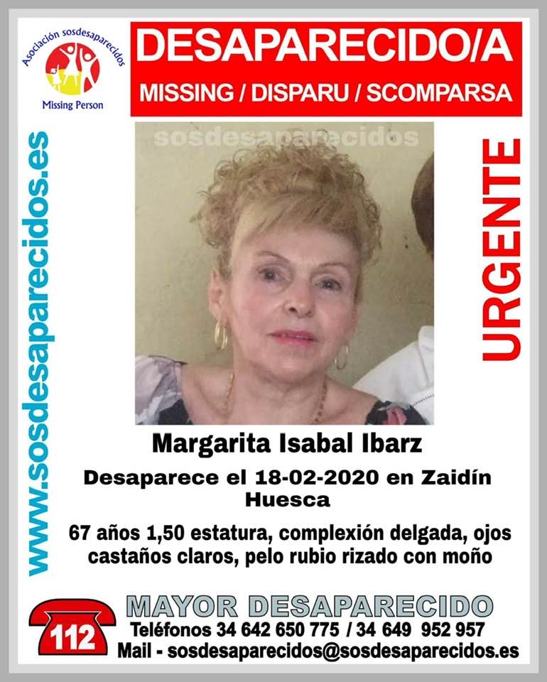 El operativo de búsqueda coordinado por la Guardia Civil reanuda este sábado en Zaidín las labores de búsqueda de Margarita Isábal Ibarz de 67 años que lleva desaparecida desde el martes día 18 de febrero. La mujer es de complexión delgada, ojos castaños, pelo rubio rizado con moño.