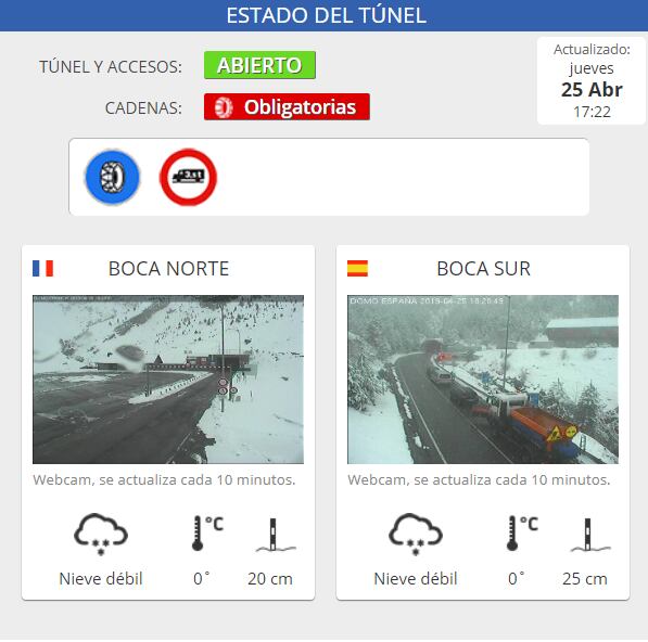 El Consorcio del túnel de Bielsa-Aragnouet informa de que la utilización de cadenas es obligatoria para todos los vehículos y además se prohíbe el paso a los camiones por este paso transfronterizo. El último temporal ha dejado una acumulación de entre 20 y 25 centímetros de nieve en ambos lados del túnel.