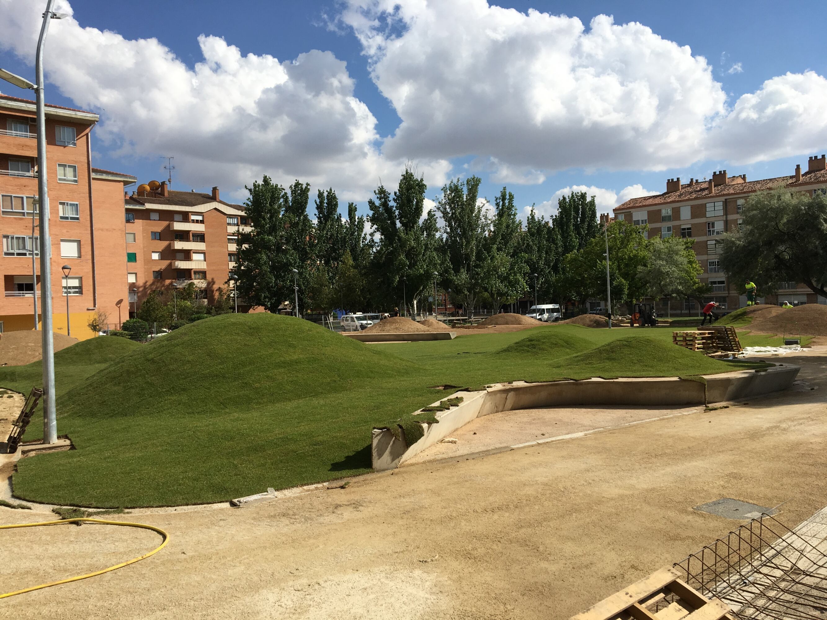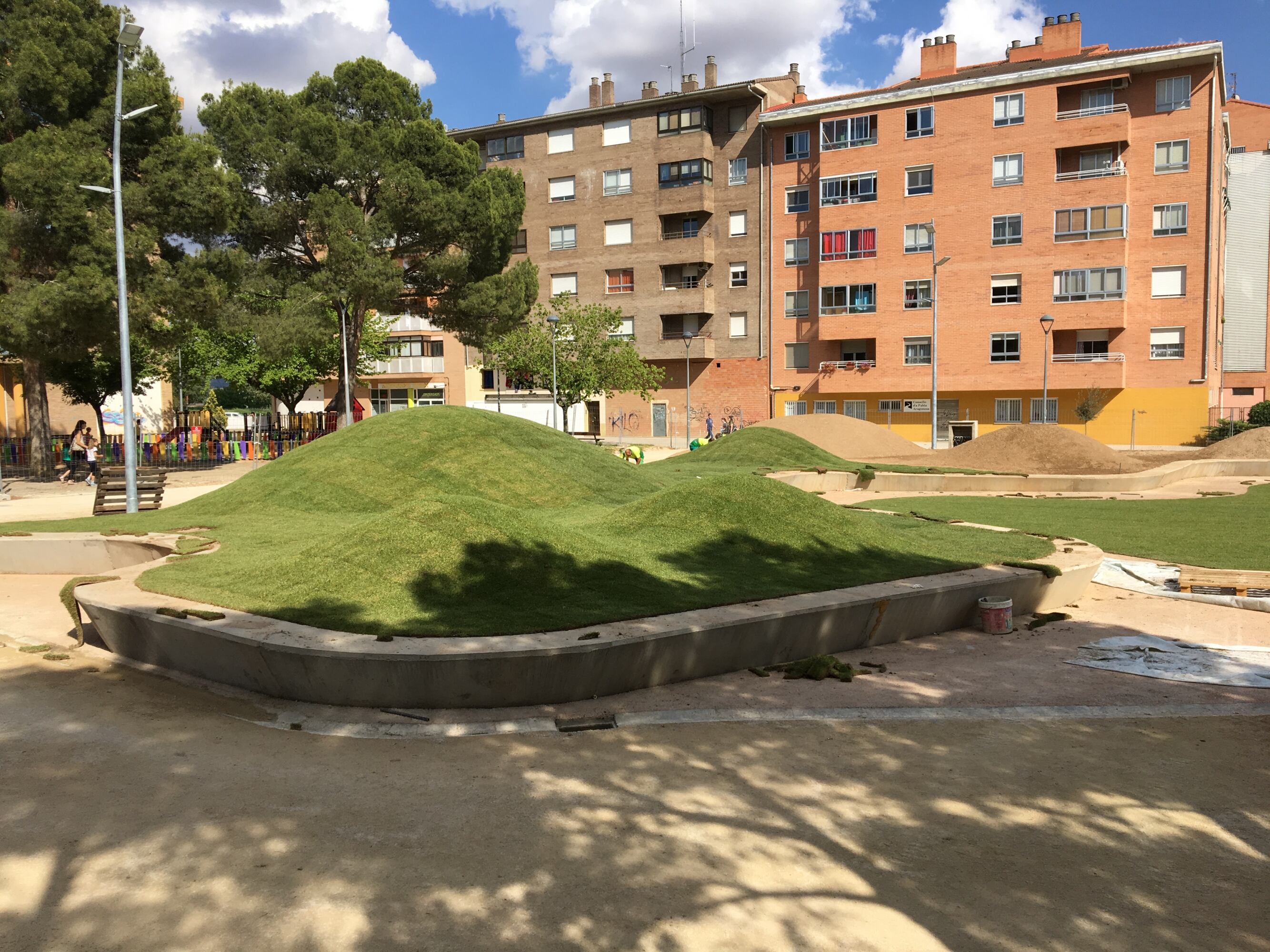 Continúa la renovación del parque de San Martín en la capital oscense, en la zona denominada comúnmente como Torre Mendoza. Avanza la primera fase de los trabajos y ya se puede observar un cambio importante, el hormigón da paso al césped que ya se está colocando en la zona central que cuenta también con unos montículos como los que existen en el parque de las olas.