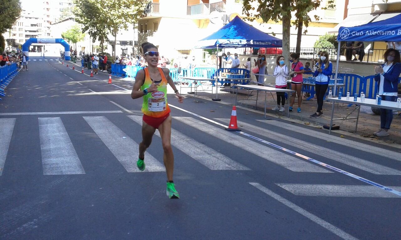La atleta Mari Carmen Caballero disputaba la prueba con la camiseta de Hugo Loriente, atleta del CA Barbastro-Julián Mairal que fallecía recientemente. Caballero con este gesto quería recordar y homenajear al atleta barbastrense.