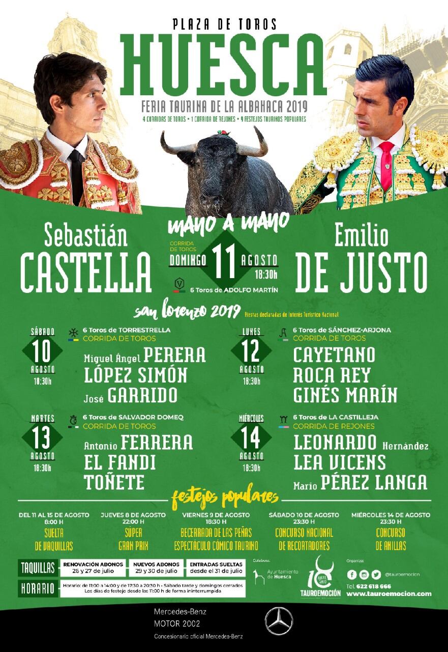 El abono oscense cuenta con cuatro corridas de toros y una de rejones, en la que destaca, además del mencionado mano a mano, la presencia de Roca Rey, así como la participación de varios de los triunfadores de San Isidro, jóvenes y diversidad ganadera. Las combinaciones son las siguientes: