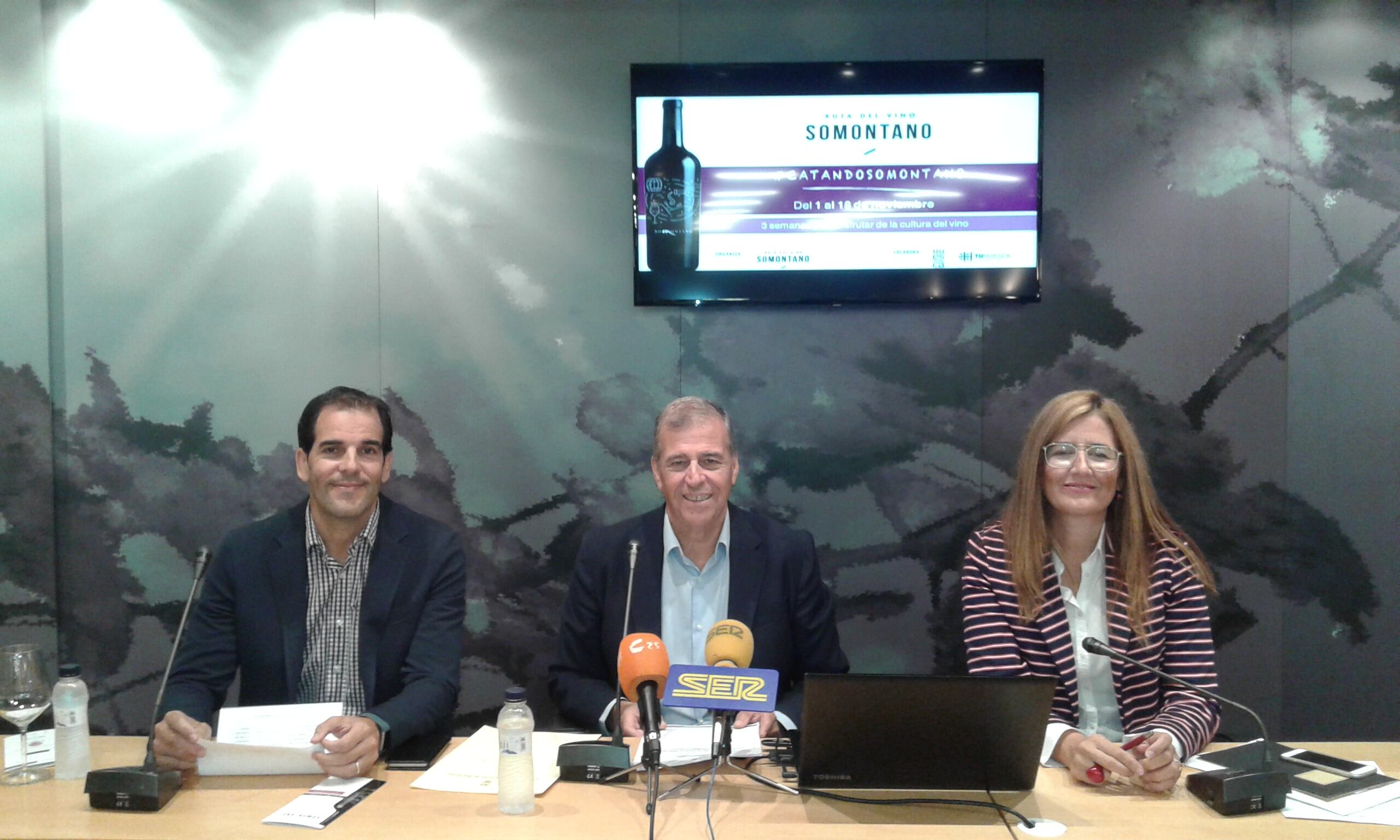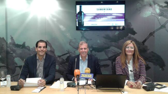 El presidente de la Asociación para la Promoción Turística de Somontano, Antonio Cosculluela, el vicepresidente de la Comarca de Somontano, Daniel Gracia, y la presidenta del Consejo Regulador de la Denominación de Origen Somontano, Raquel Latre han presentado este martes los detalles de esta nueva edición de CatandoSomontano.
