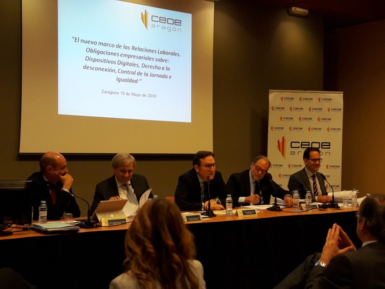 A resolver dudas y facilitar el cumplimiento por parte de las empresas contribuían las explicaciones en la jornada por parte de la Directora General de Trabajo del Gobierno de Aragón, Soledad de la Puente; el Director Territorial de la Inspección de Trabajo y Seguridad Social, Román García Oliver; Juan García Blasco, Catedrático de Derecho del Trabajo y de la Seguridad Social; Arturo Acebal, Socio-director de Acebal Abogados; Salvador Sánchez, Director de Recursos Humanos del Grupo SAMCA y José Ramón Til, Director de RRHH de Grupo SAICA para España y Portugal, y Presidente de la Comisión de Relaciones Laborales de CEOE Aragón; que han intervenido junto al Presidente de CEOE Aragón, Ricardo Mur, y su Director General, Jorge Díez-Ticio.