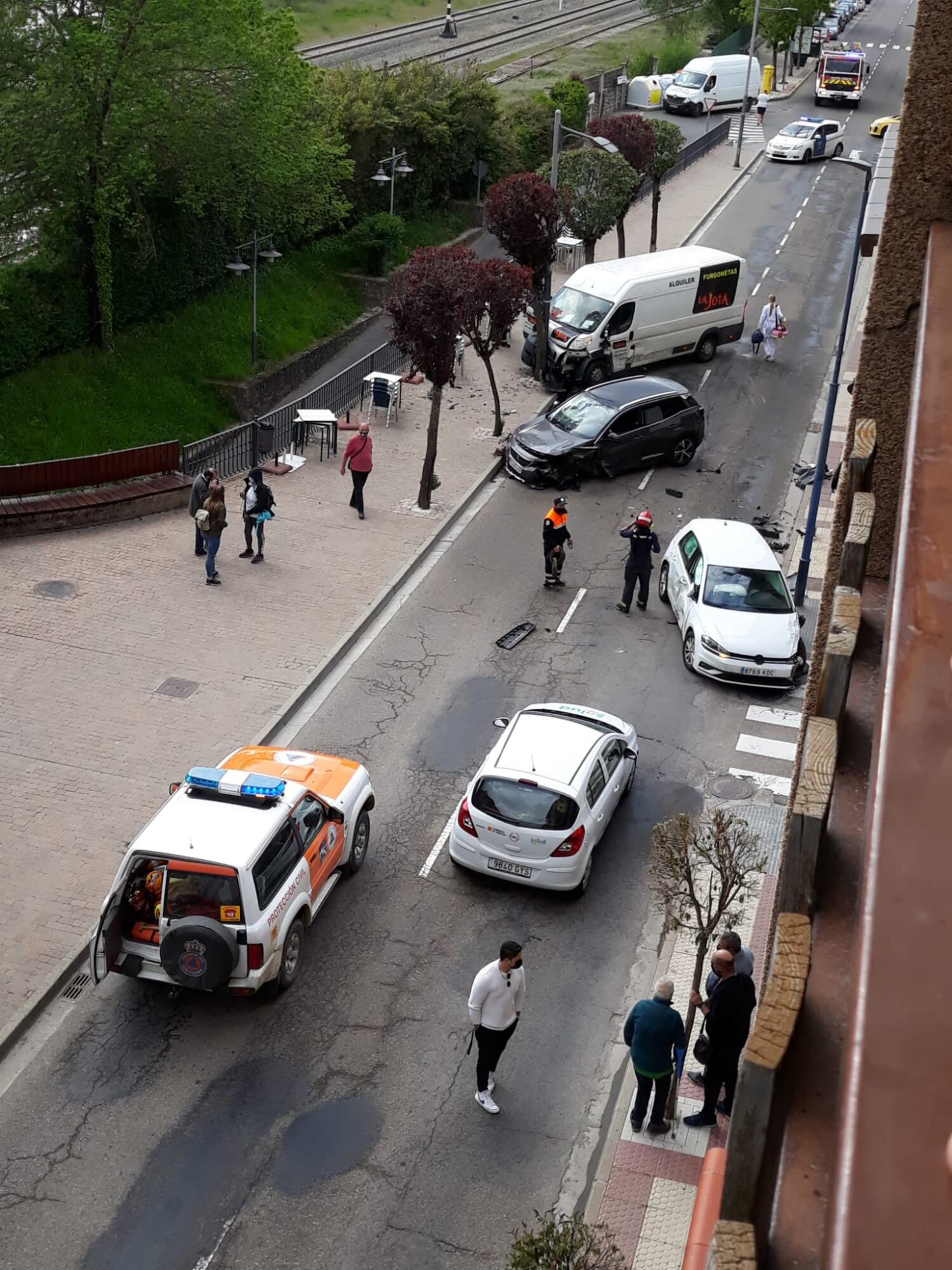 Se veían implicados dos vehículos en un choque frontolateral y una furgoneta, que acababa chocando contra una farola. Acudían al incidente bomberos, protección civil y miembros de la policía local.