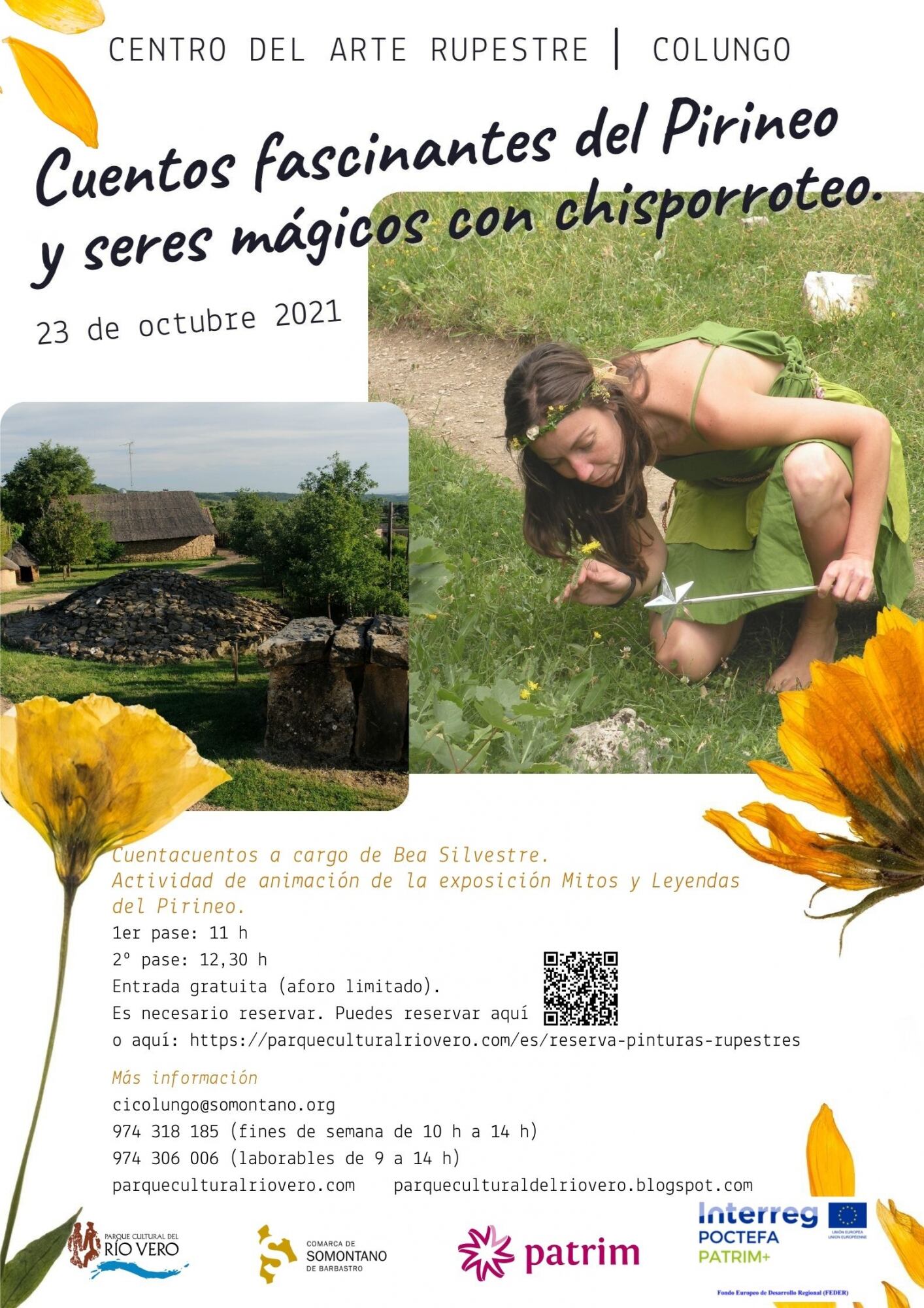 El Centro de Arte Rupestre en Colungo acogerá el sábado 23 de octubre la actividad de animación Cuentos fascinantes del Pirineo y seres mágicos con chisporroteo, a cargo de la compañía Chisporroteo, que de la mano de Bea Silvestre descubrirá este mundo legendario. El cuentacuentos consistirá en un paseo rimado por los seres mágicos y las leyendas de la cordillera pirenaica: hadas, duendes, brujas, gigantes y hasta algún dragón que también pertenece al legendario Aragón.