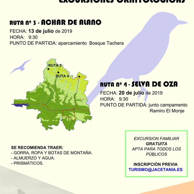 La primera salida, el sábado 13 de julio, recorrerá el Achar de Alano (Ruta nº 3). El punto de partida será el Camping Zuriza a las 09:30h. Los interesados en asistir a esta primera excursión deben inscribirse a través del email turismo@jacetania.es, antes de las 14h del viernes día 12, indicando su nombre y apellidos, edad, DNI y teléfono de contacto.