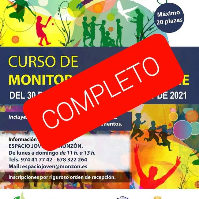 Este lunes se abría el plazo de inscripción del curso semipresencial de monitor de tiempo libre. Según informa el Espacio Joven de Monzón en esta primera jornada se han completado las 20 plazas ofertadas con un coste de matrícula de 130€.