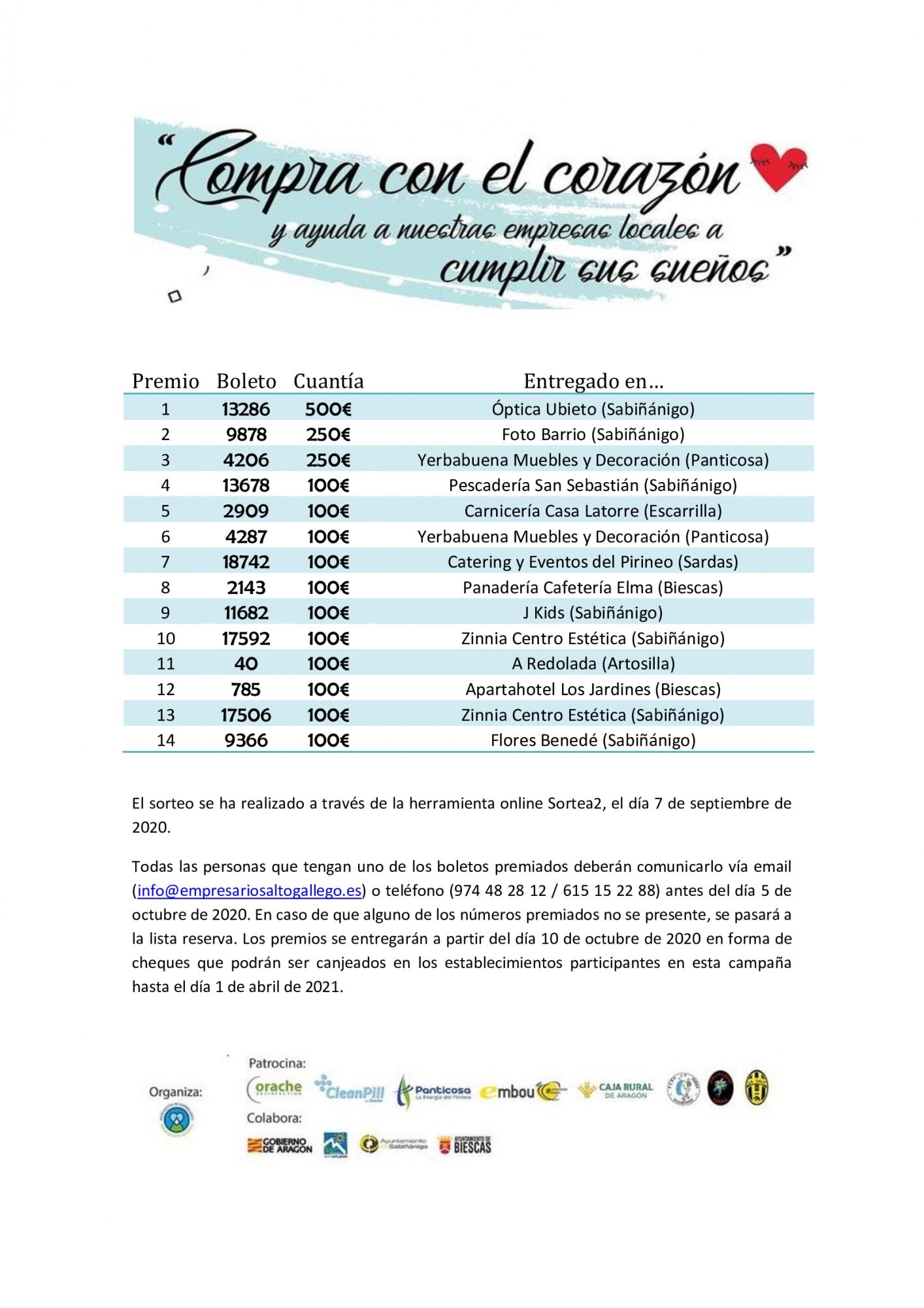 La campaña dinamización “Compra con el corazón y ayuda a nuestras empresas a cumplir sus sueños”, que ha llevado a cabo en el mes de agosto la Asociación de empresarios "Pirineos" Alto Gállego, ya cuenta con los boletos premiados, mediante un sorteo que se ha realizado a través de la herramienta online Sortea2.