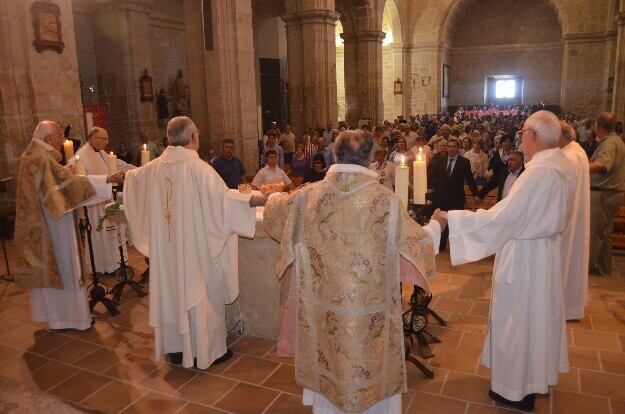 El obispo Ángel Pérez estuvo acompañado por el párroco Antonio Mozás, visiblemente emocionado durante toda la celebración, por los sacerdotes José María Ferrer y Francisco Campo y por los dos primeros curas que se ordenaron en este templo nada más pasar de la Diócesis de Lérida a la de Barbastro en 1957: Eloy Latorre y Jaime Mozás.