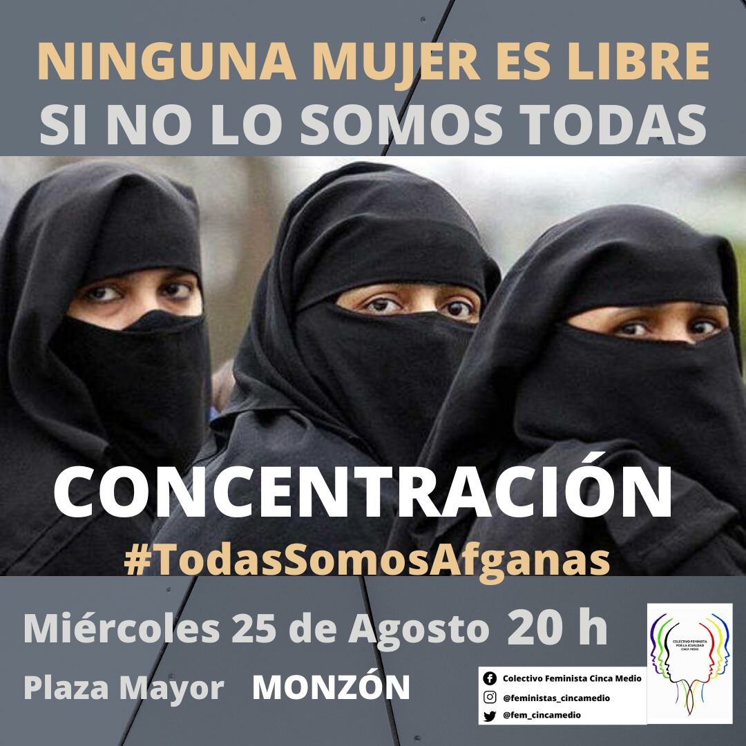 El Colectivo Feminista del Cinca Medio amplía su convocatoria del último miércoles de cada mes en la Plaza Mayor, a las 20:00h, por las mujeres asesinadas a las mujeres afganas para mostrar su apoyo a la situación por la que están pasando, con la llegada de los talibanes al poder.