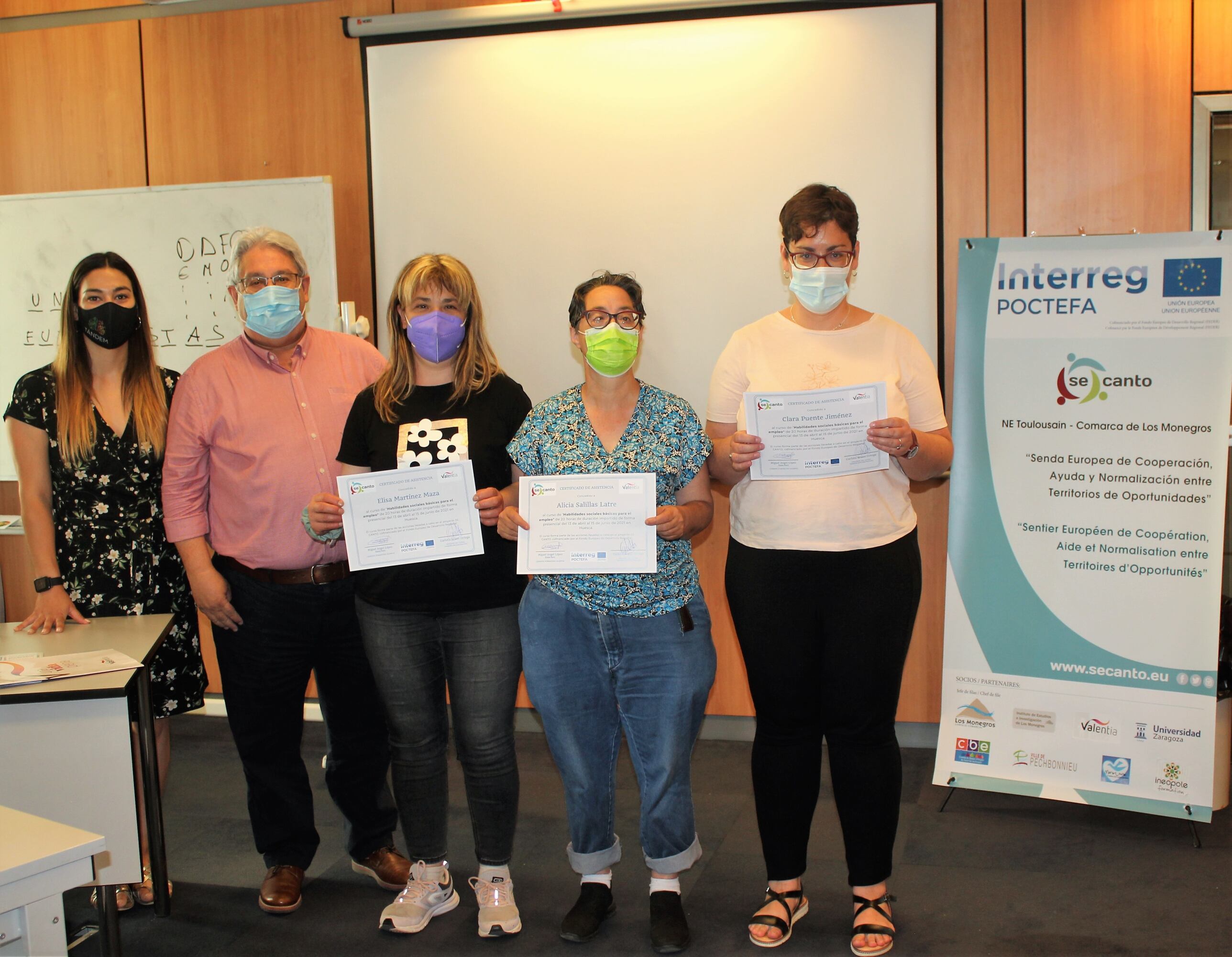 El director gerente de Valentia, Miguel Ángel López, ha entregado los diplomas de fin de curso a las cinco alumnas participantes. Todas ellas son trabajadoras del centro especial de empleo Manuel Artero de Valentia en Huesca y se muestran muy satisfechas con las herramientas aprendidas durante el curso de habilidades sociales impulsado por el proyecto POCTEFA SE CANTO. Ha estado impartido por la psicóloga Carlota Bravo Ortega, quien también realiza un balance muy positivo de la formación. “Se ha plantado la semilla del cambio que es mejorar en el autoconocimiento y en detectar tanto las debilidades como las fortalezas, lo que ahora me está sirviendo y lo que dificulta o empeora mi relación en el entorno laboral. Ahora, lo que queda, es seguir en ese camino asentando y reforzando estos primeros pasos. Y eso es lo que intentaremos en la continuación del curso, asentar y avanzar para mejorar su integración en sus puestos de trabajo”, señala la psicóloga.