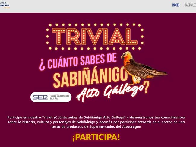 El Trivial "¿Cuánto sabes de Sabiñanigo y Alto Gallego?" está disponible ya en la web y se podrá concursar hasta el 20 de marzo. Las preguntas, patrocinadas por distintas firmas comerciales, se pueden escuchar en la programación de Radio Sabiñánigo y concursar a través de la web de Radio Huesca, en esta misma información, o en los próximos días, en la sección "En Otra Onda".