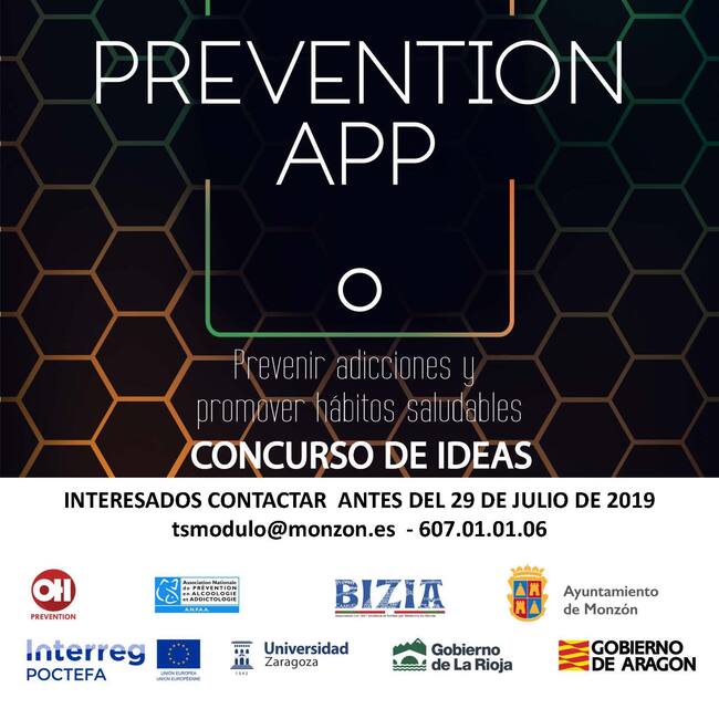 El Gobierno de Aragón, a través de un proyecto INTERREG-POCTEFA financiado por la Unión Europea (UE), convoca el concurso de ideas Prevención App para el desarrollo de aplicaciones de prevención de adicciones y reducción de riesgos con el objeto promover la prevención de drogodependencias y otras adicciones entre la población juvenil.