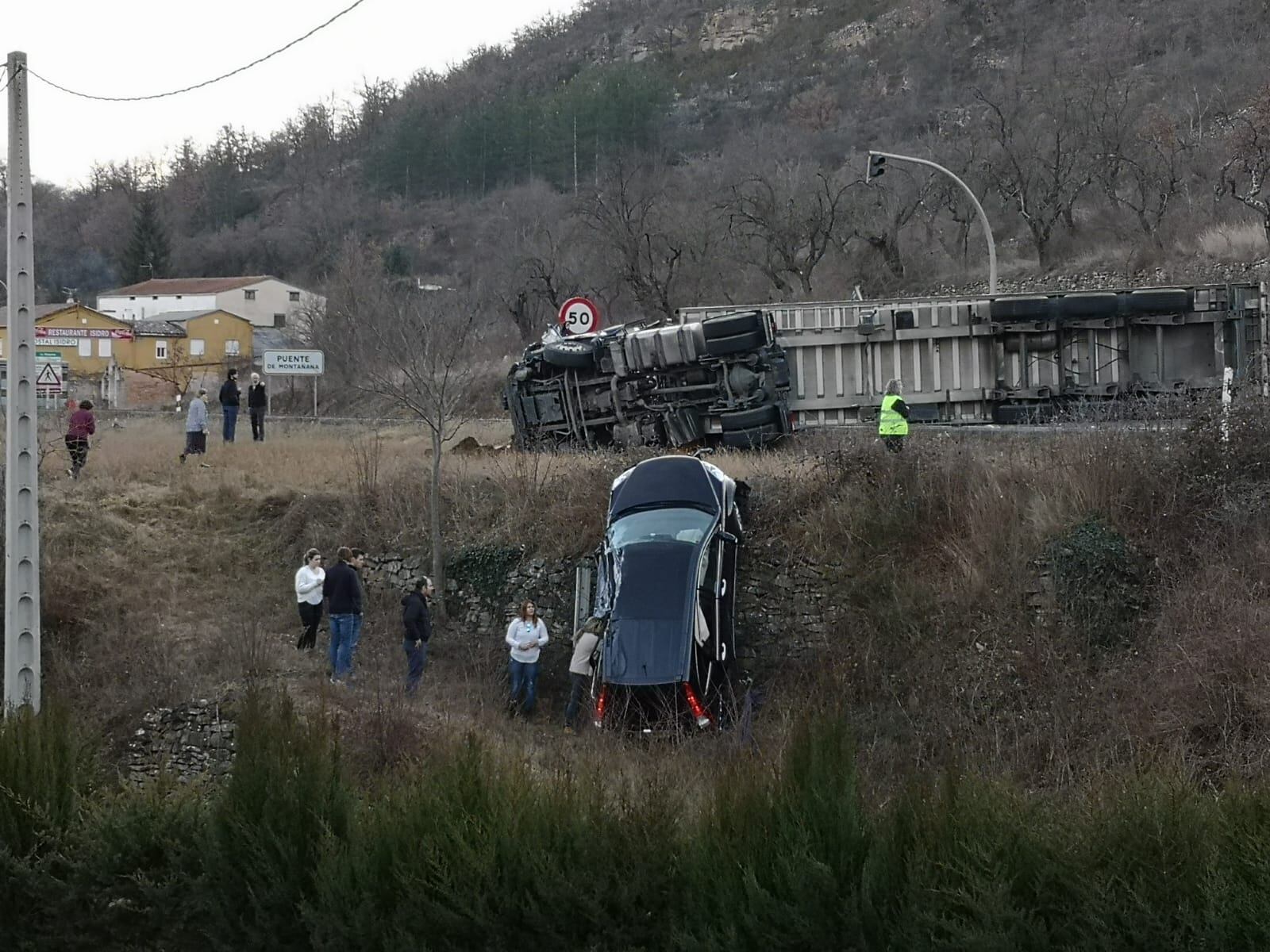 La circulación en la carretera N-230 quedaba interrumpida, desde aproximadamente las 17.55 hasta las 20.35 horas, en ambos sentidos, a la altura del p.k, 89, en el término municipal de Puente de Montañana (Ribagorza) como consecuencia de un accidente de tráfico de un camión, que transportaba maíz, y que, por causas que se desconocen,  habría volcado afectando a la circulación en los dos carriles de la vía. Según fuentes consultadas, en el suceso se habrían también visto implicados también el vehículo que venía de frente y el que circulaba tras el camión.