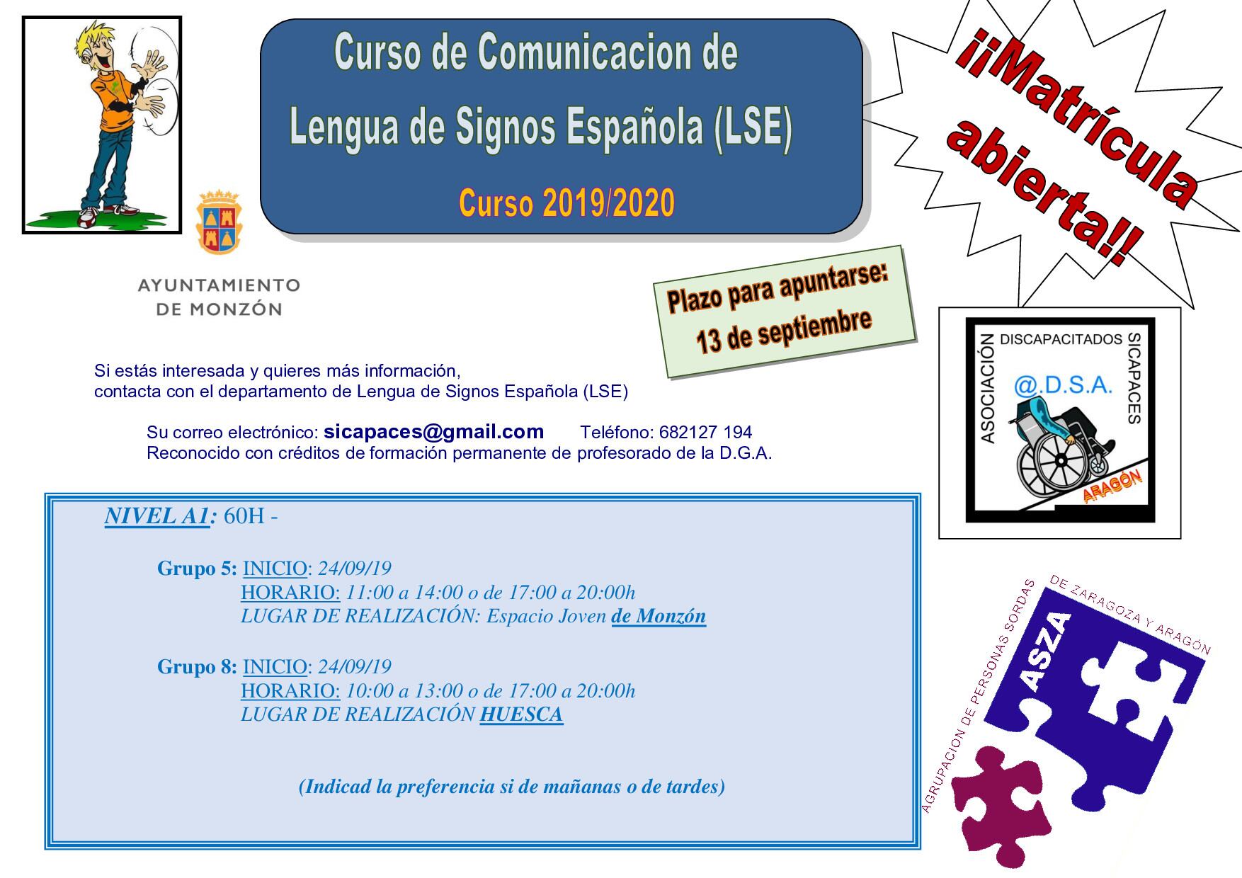 La Asociación Sicapaces Aragón organiza un Curso de lengua de Signos A1, que comenzará el 24 de septiembre y será impartido por ASZA. Las inscripciones deben realizarse antes del 13 de septiembre y las plazas son limitadas.