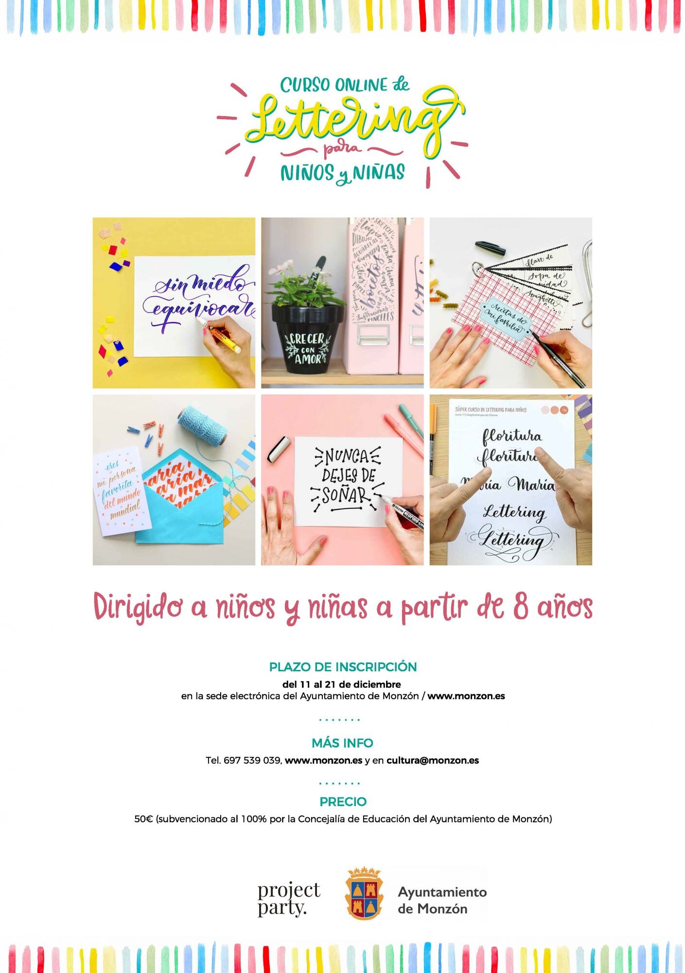 La Concejalía de Educación del Ayuntamiento de Monzón organiza un curso online de lettering dirigido a niños a partir de 8 años. Sin horarios y al ritmo que cada alumno decida, los niños podrán aprender a expresarse a través de este arte con una formación sencilla cargo de Proyect Party que despierta su creatividad.