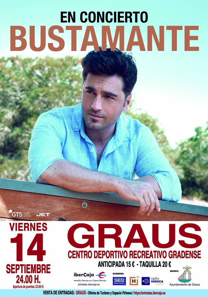 El cantante cántabro será el concierto estrella de las fiestas patronales de Graus que se celebran del 12 al 15 de septiembre en honor al Santo Cristo y San Vicente Ferrer. Bustamante actuará el viernes 14 a las 24.00 horas en las instalaciones del centro recreativo grádense. Las entradas anticipadas se pueden adquirir al precio de 15 euros en la oficina de turismo y Espacio Pirineos de Graus y también en ibercaja.es. El concierto está organizado por el Ayuntamiento de Graus y recomendado por Radio Huesca y Huesca Tv.